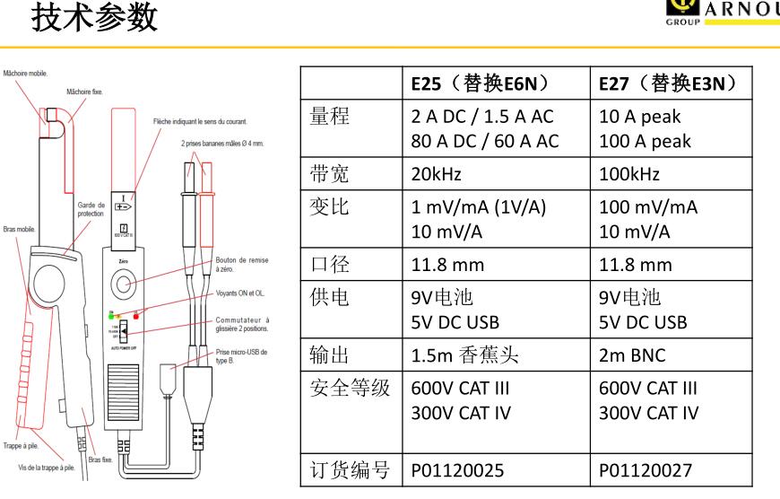 E25和E27交直流电流钳介探头设计用于DMM、示波器和存储记录仪的扩展测量。精确测量、分析并显示失真电流波形和谐波,狭长钳口设计,方便使用于布线密集的窄小空间。