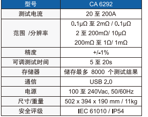 法国CA 6292高精度微欧计可调测试电流从5至200A,可调测试时间从5至120秒,可使用选配的电流探棒做BSG接地测试,测试电流高达200A低接触电阻精确测量,测试电阻从0.1μΩ至1Ω,0.1μΩ 高分辨率.冷却系统可以使连续测试变的可行,背光显示功能。 数字显示带数据存储功能,可调测试电流和测试时间,并可通过应用软件生成报告。