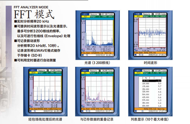 5、三种显示方式:振动表,时域谱和FFT分析功能。测量数据保存在存储卡上。