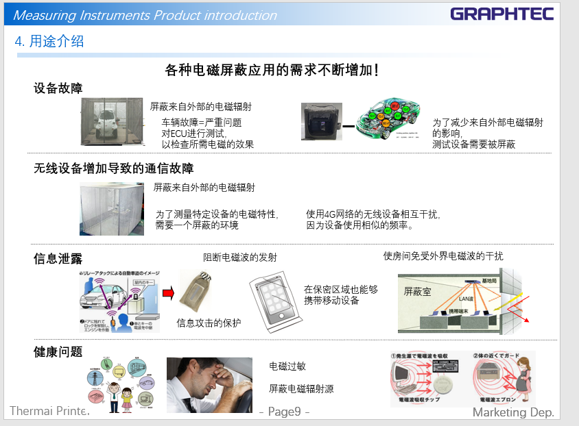 如今阻隔家用电器、个人电脑、手机、电动汽车等设备产生的电磁波成为一个重要问题。日本图技电磁屏蔽柜针对家用电器、个人电脑、手机、电动汽车等设备产生设备在运行中受外界电磁波的干扰,确保其正常工作,为了检查设备故障的原因并加以预防,人们越来越需要创造一种电磁屏蔽的环境。因此,GRAPHTEC提出了一种比无线电电波暗室和屏蔽室更容易建立屏蔽环境的方法。具有体积小、安装方便、使用灵活的特点,非常适合在那些不适宜安装电磁屏蔽室又需要对信息设备提供保护的场使用。合使用。