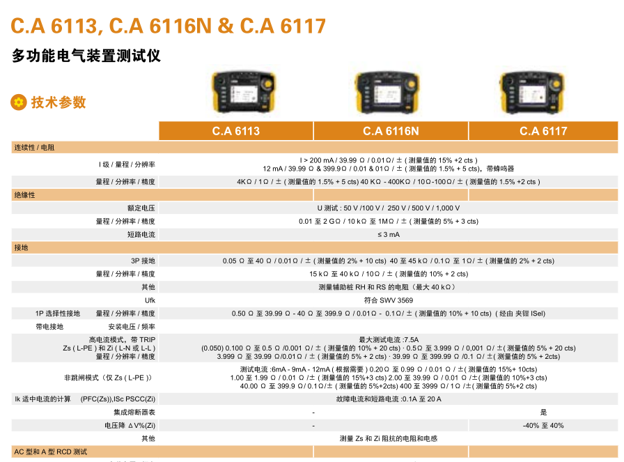 法国CA 6113多功能电气装置测试仪集所有电气测试功能于一身,同时测量接地电阻测量:打地桩式、回路阻抗,导通性测量(0.2A,绝缘电阻测量,RCD 测试:跳闸电流和时间,自动测试顺序,测量结果可存储,支持安卓应用生成报告,可充电电池供电。