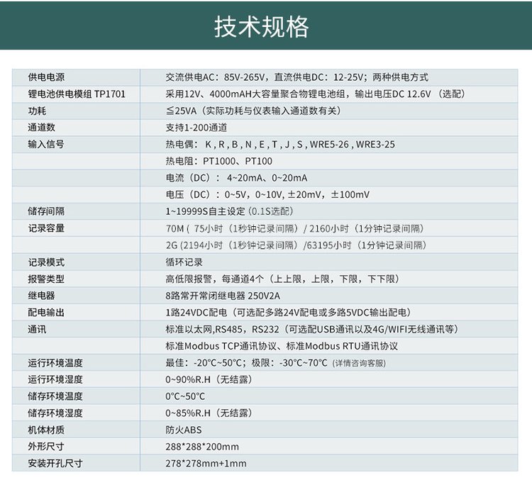 TP700多路数据记录仪支持温度、湿度、电流、电压、压力、液位、流量、位移等同时测试,、液晶显示、U盘保存的仪表。是利用无纸记录仪可输入标准电流、标准电压、频率、热电偶、热电阻等信号,采用简约外观设计,轻便易用,可无线远传至电脑IE&手机微信监控。以*进的CPU为核心,基于智能化、数字化、网络化设计思想,辅以大规模集成电路、大容量FLASH存储、信号智能调理、SmartBus总线以及高分辨率图形液晶显示器的新型智能化无纸记录仪。